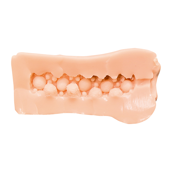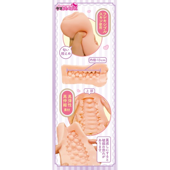 Inside, large rounded massage nubs (玉イボ) create bumpy textures that alternately tease and grind. The upper section features softer, smaller bumps that gently tickle, while the lower part has firmer, oversized nodules that push and press firmly against the underside for sharp stimulation. This contrast mirrors the emotional highs and lows of a landmine girl’s intense intimacy.
